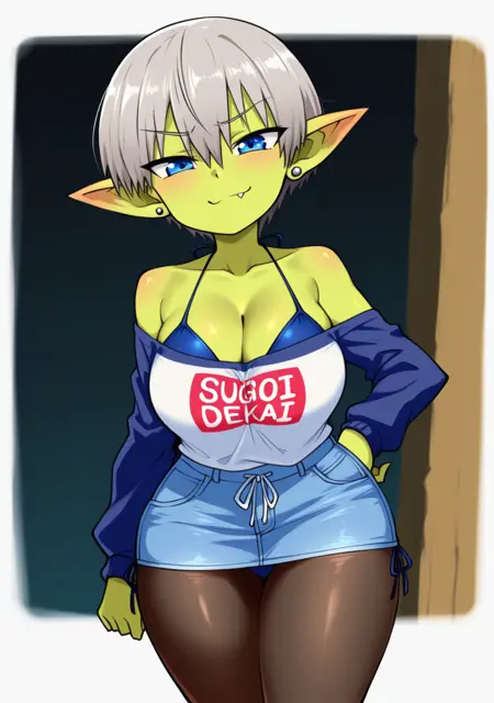 提示词:GobGirl、绿色皮肤、矮小、长耳朵、大耳朵、穿孔、彩色皮肤、monster_girl 1girl、尖耳朵、哥布林、短小身材、长尖耳朵、耳环、