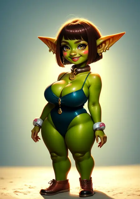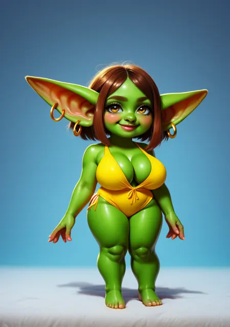Prompts: GobGirl, green skin, short, long ears, large ears, piercings, colored skin, monster_girl 1girl, pointy ears, goblin, shortstack, long pointy ears, earrings,