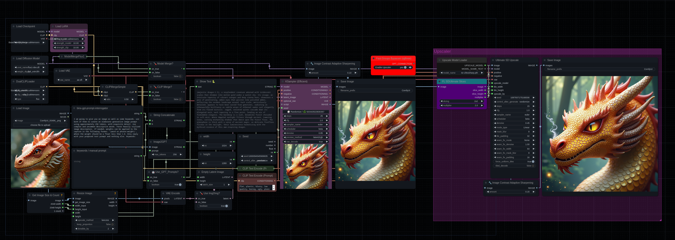 此工作流使用 Flux + Img2Img + GPT-4o-mini 来创建并放大提供的提示。据我经验,它的效果非常好。