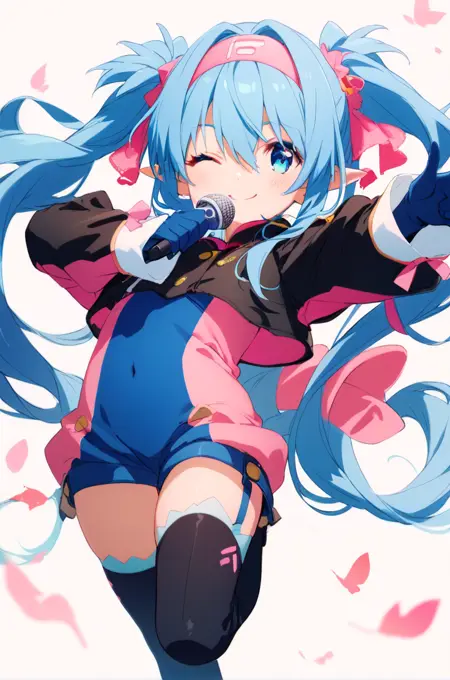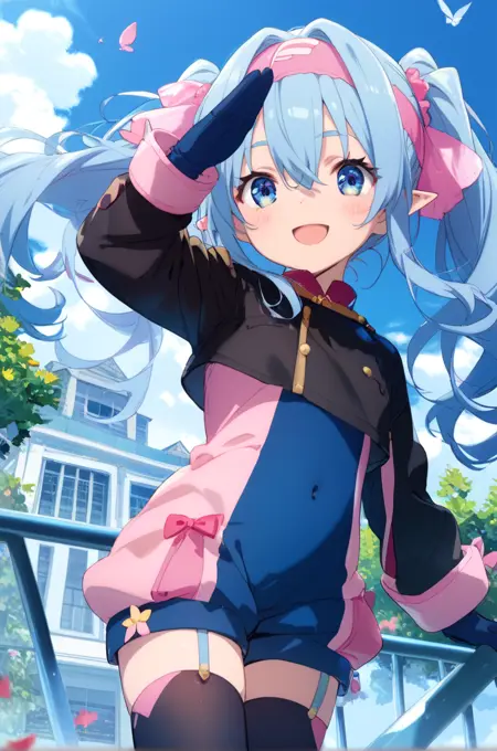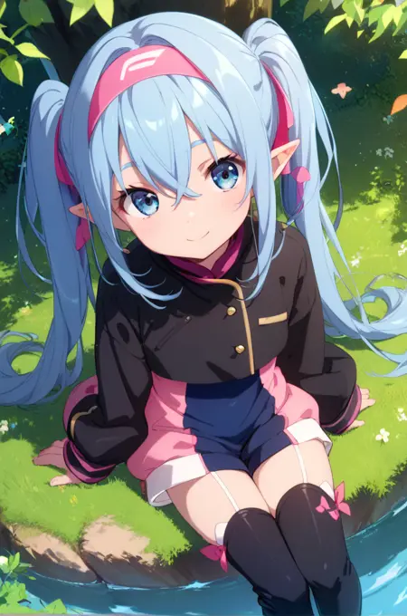 klan klein, blue hair, blue eyes,twintails, pink headband, hair ornament, pointy ears, very long hair, dark skin,