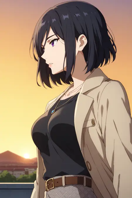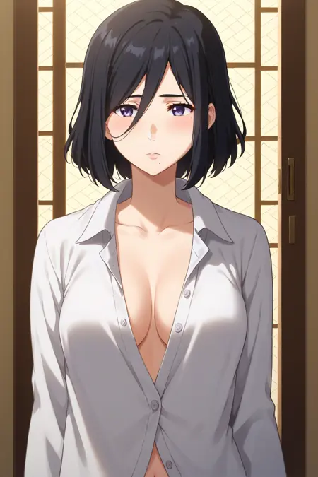 트리거: kjoizumi, 검은 머리, 보라색 눈, 중간 길이 머리, 눈 사이의 머리, 입 밑의 점,