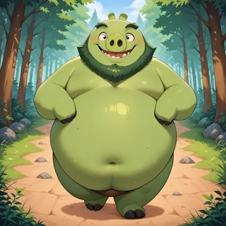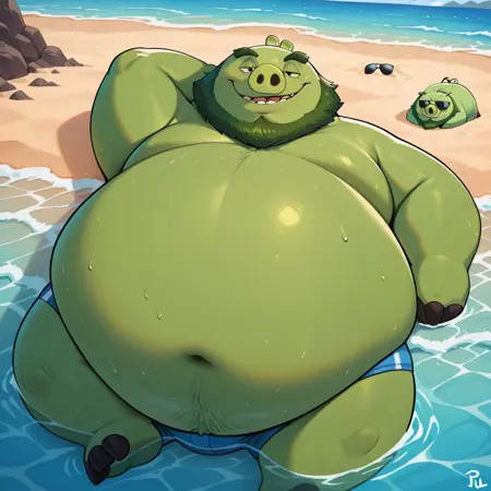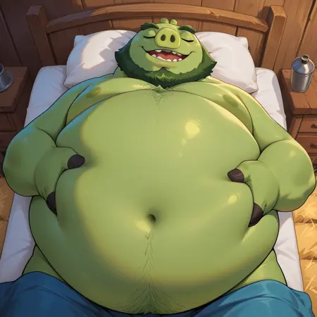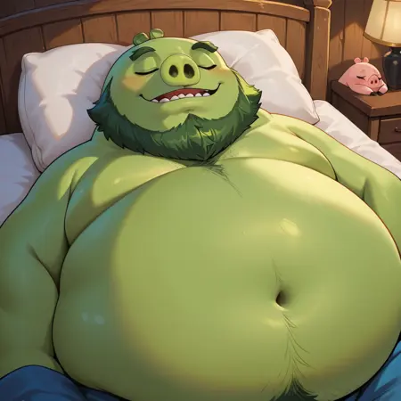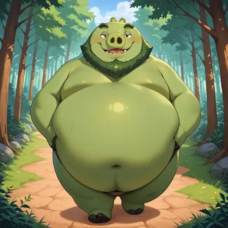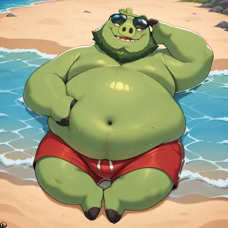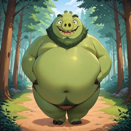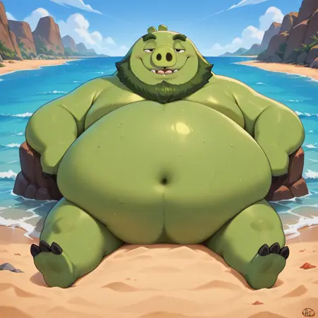 最良の正の入力: (king leonard mudbeard, cartoon, pig, anthro, fat, green body, beard, three toes,)