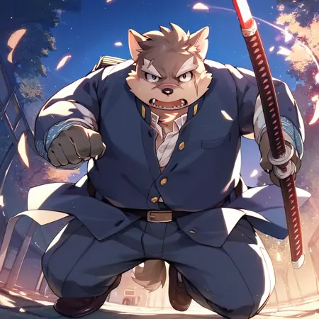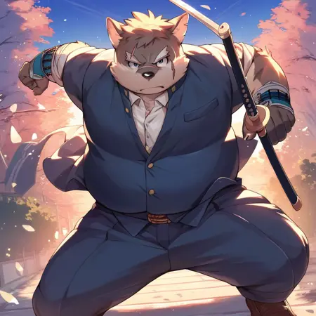 최상의 긍정 입력: (모리타카, 인트로, 강아지, 통통한, 뚱뚱한, 회색과 베이지 털, 흉터, 검은 밑창)