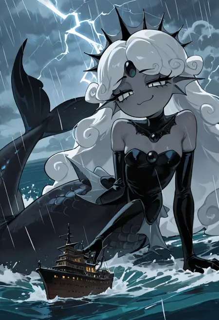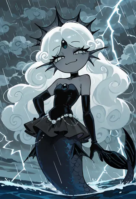推奨タグ:「ブラックドレス、グレー肌、ダークスキンの女性、グレーの目、まつ毛、白髪、ブラック肘手袋、頭のヒレ、ドット目、ブラックパール、黒い額の宝石、鼻なし、マーメイド、縦に細長い瞳」