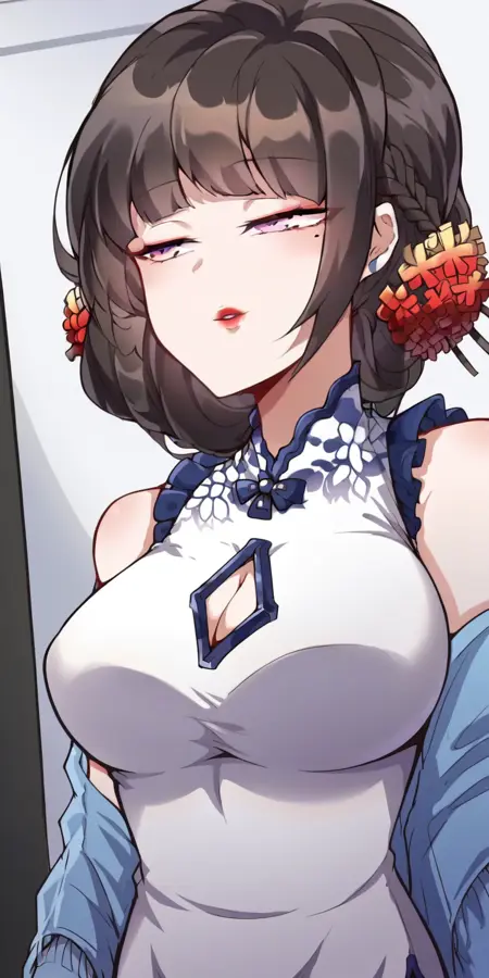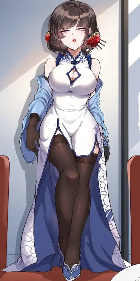 | 训练词汇 | large breasts, black hair, hair ornament, thighhighs, gloves, dress, cleavage, bare shoulders, purple eyes, flower, sleeveless, black gloves, black thighhighs, hair flower, white dress, mole, high heels, clothing cutout, sleeveless dress, chinese clothes, cleavage cutout, red flower, lace trim, china dress, side slit, blue footwear, shawl,已复制! |