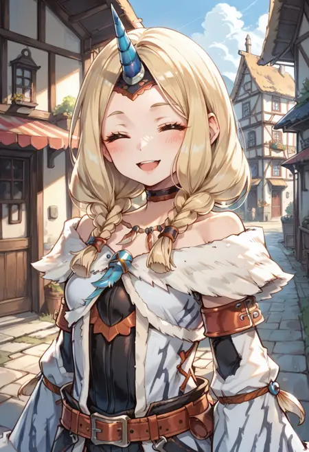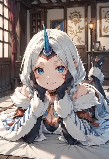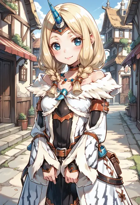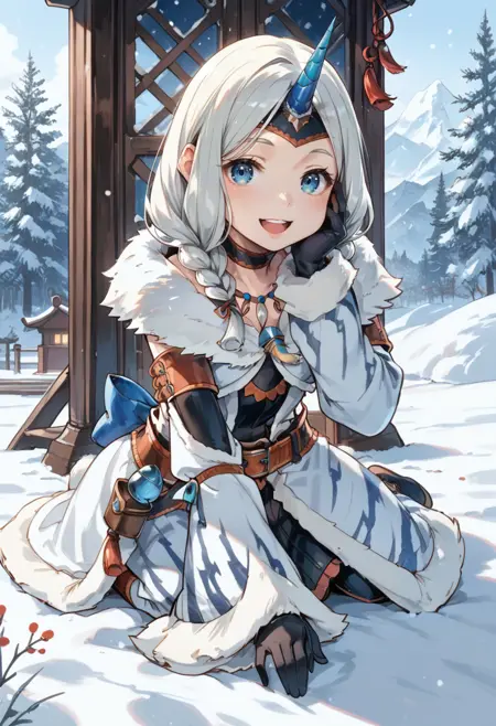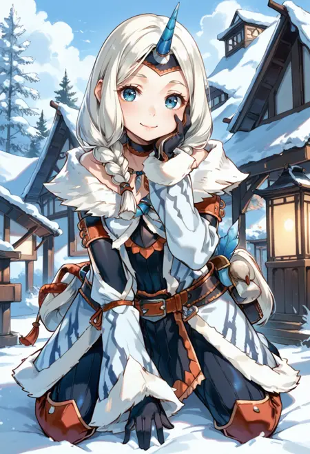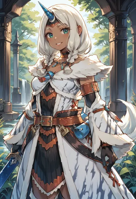 태그(옷): 키린 X 아머, 하얀 분리형 소매, 쌍꼬리 땋은 머리, 하얀 단일 뿔 헤어밴드, 하얀 털장식 코트, 하얀 무릎 부츠