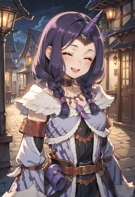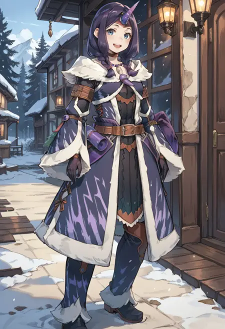 태그(보라색, 작동 안 함): 키린 X 아머, 보라색 단일 뿔 헤어밴드, 보라색 머리카락, 보라색 분리형 소매, 보라색 털장식 코트, 보라색 무릎 부츠