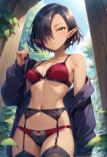 LucaKuroinu, 短发, 齐刘海, 黑发, 中等胸部, 黄色眼睛, 尖耳, 深色皮肤, 发丝遮住一只眼睛, 深色皮肤女性, 暗精灵