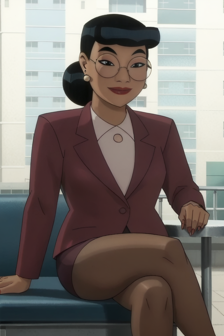 닥터 쿼인젤: Doc_Quinzel, 1girl, 여성, 셔츠, 검은 머리, 자켓, 흰색 셔츠, 귀걸이, 안경, 머리 묶음, 메이크업, 정장, 립스틱, 둥근 안경