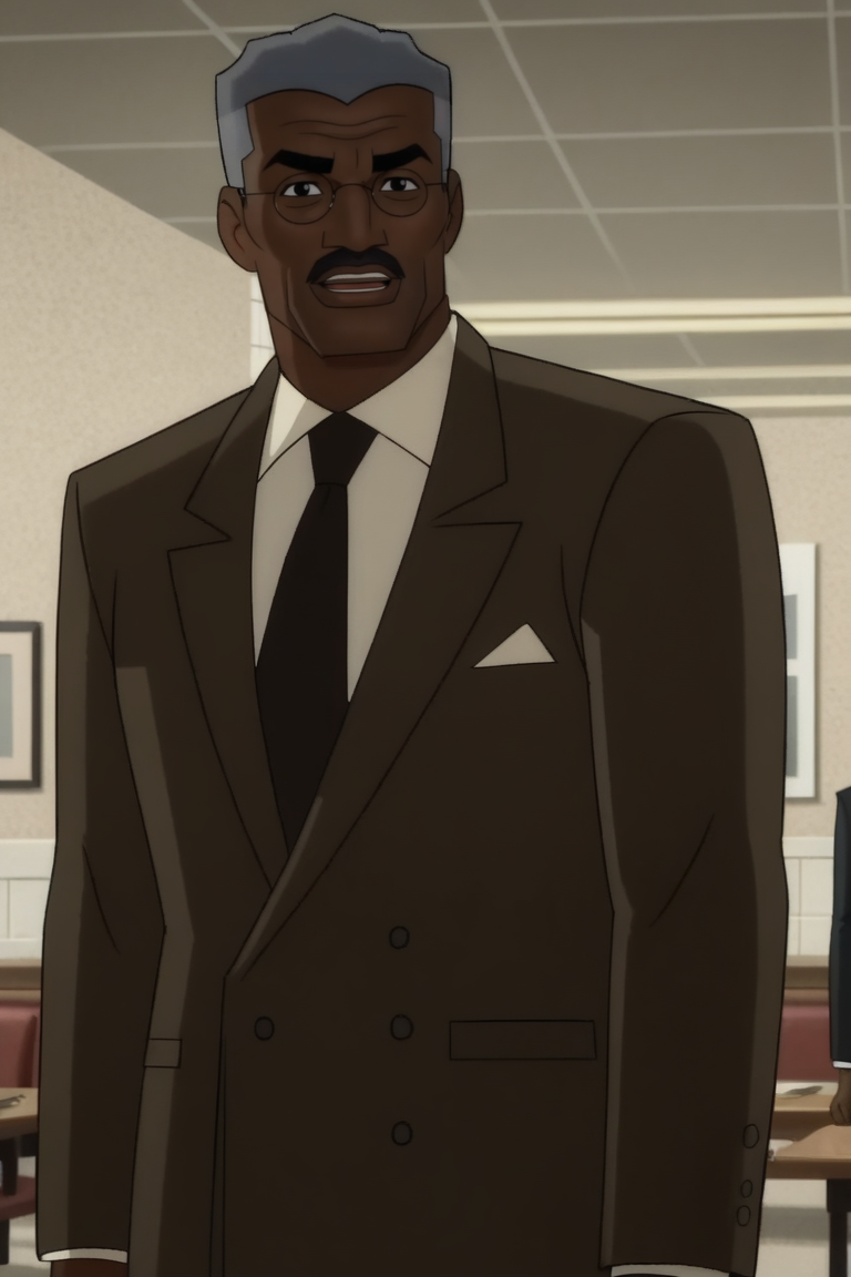 컴미셔너 고든: Jim_Gordon, 1boy, 남성, 회색 머리, 수염, 검은 피부 남성, 단발, 자켓, 흰색 셔츠, 안경, 검은 눈, 수염