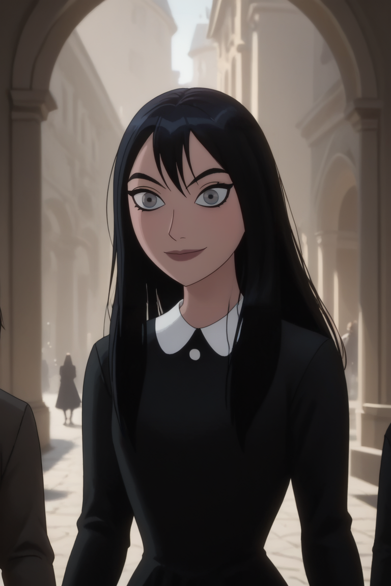 나탈리아 나이트: Nat_Knight, 1girl, 여성, 긴 머리, 검은 머리, 검은 드레스, 긴 소매, 파란 눈