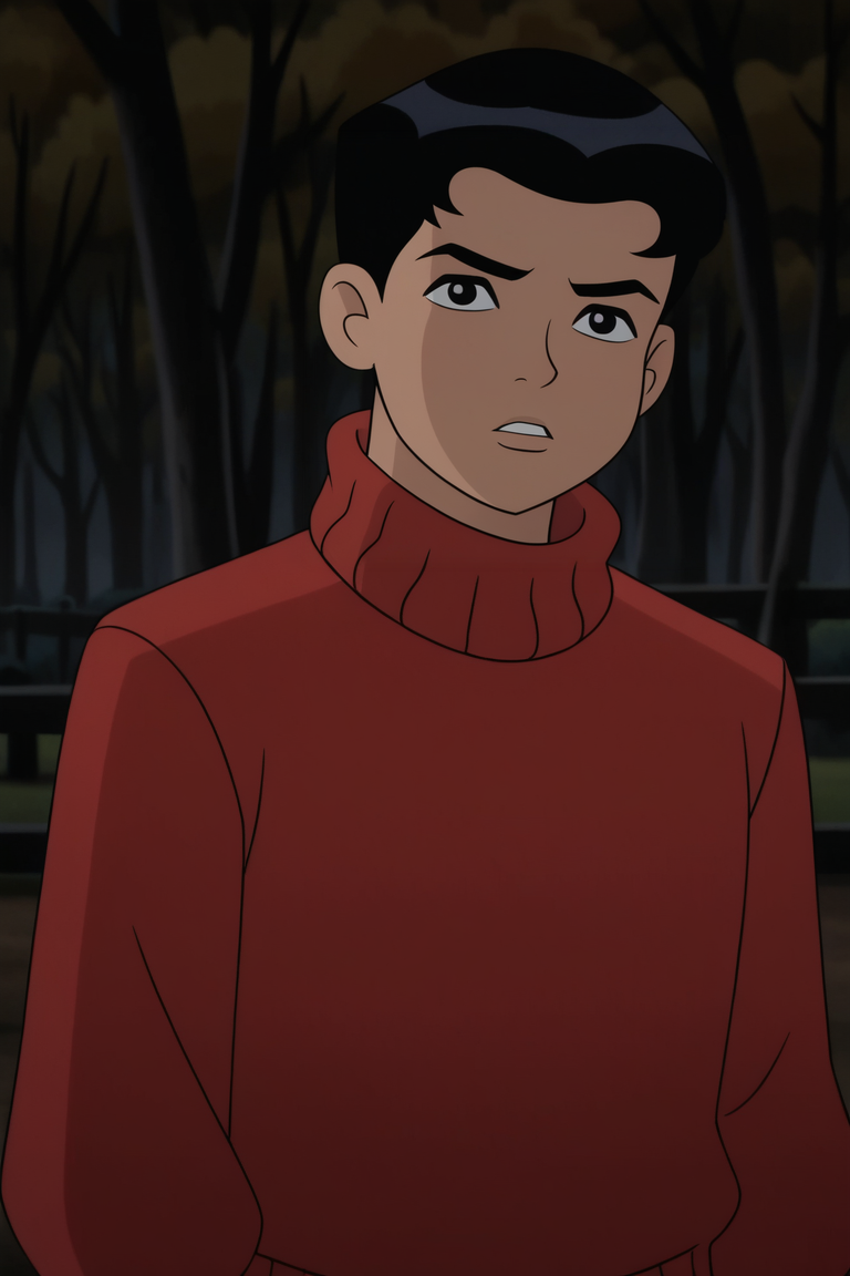 딕키: Dick_Grey, 1boy, 남성, 어린이, 단발, 검은 머리, 긴 소매, 빨간 스웨터, 터틀넥, 갈색 바지,