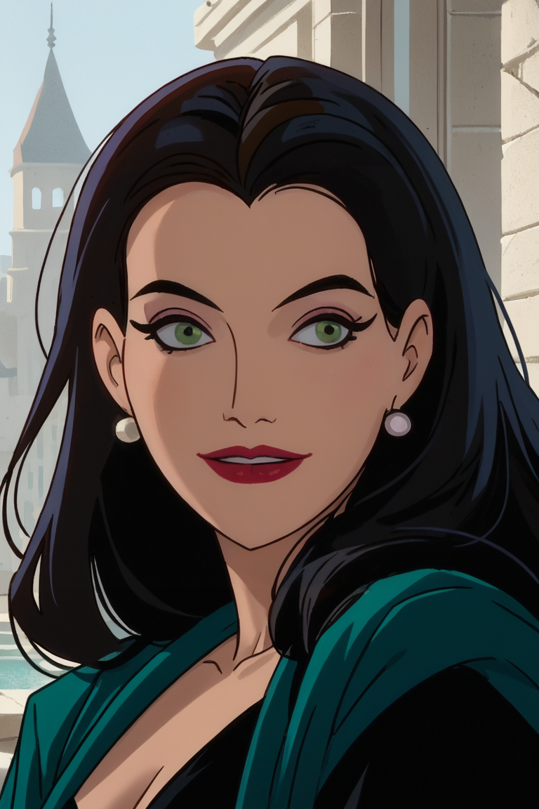 셀리나 케일: Selina_Kyle, 1girl, 여성, 긴 머리, 검은 머리, 녹색 눈, 귀걸이, 붉은 입술, 보석