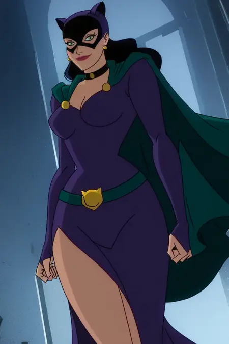 캣우먼: Cat_woman, 1girl, 여성, 캣우먼 마스크, 캣우먼 드레스, 녹색 눈, 긴 머리, 검은 머리, 가슴 노출, 보석, 귀걸이, 콜라, 벨트, 망토, 마스크, 도미노 마스크