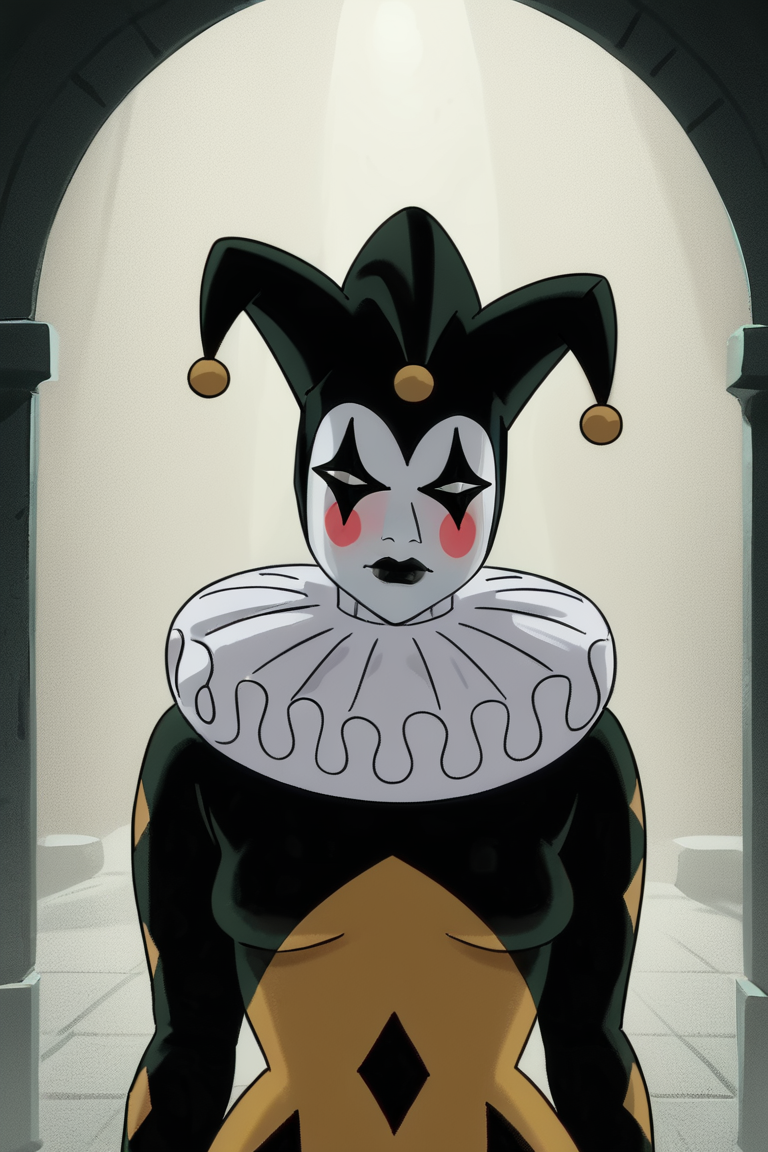 해럴리 퀸: Harley_Quinn, 1girl, 여성, 클라운 슈트, harley_Mask, 뺨 홍조, 모자, 뺨 스티커, 클라운 모자, 장갑