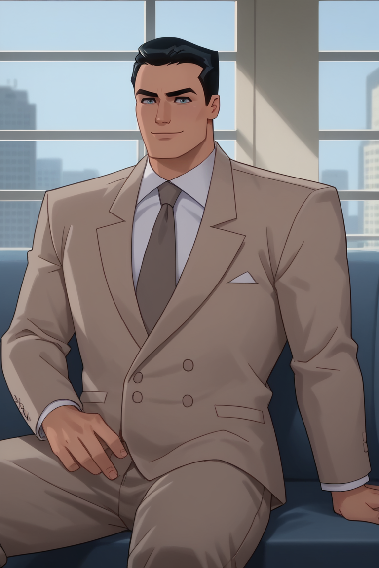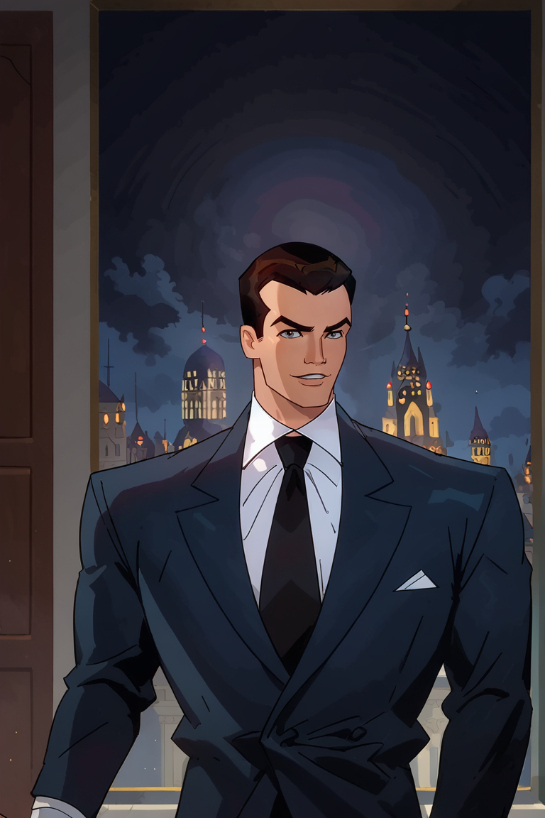 브루스 웨인: Bruce_Wayne, 1boy, 남성, 단발, 셔츠, 검은 머리, 자켓, 흰색 셔츠, 넥타이, 바지