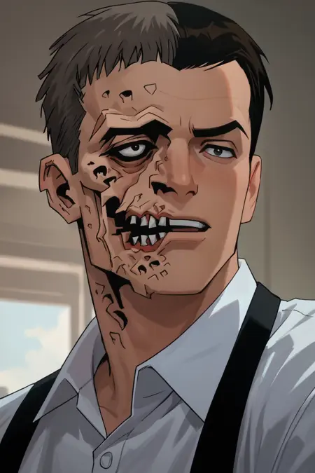 투페이스: Two_Face, 1boy, 남성, 단발, 정장, 검은 머리, 흰색 셔츠, 컬러드 셔츠, 검은 눈, 넥타이