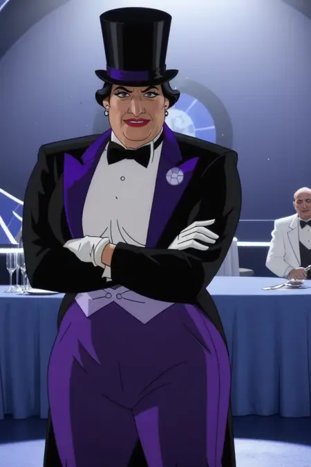 펭귄: Os_Walda, 1girl, 성숙한 여성, 검은 머리, 장갑, 높은 모자, 리본, 흰 장갑, 넥타이, 바지, 단안경, 정장, 신발