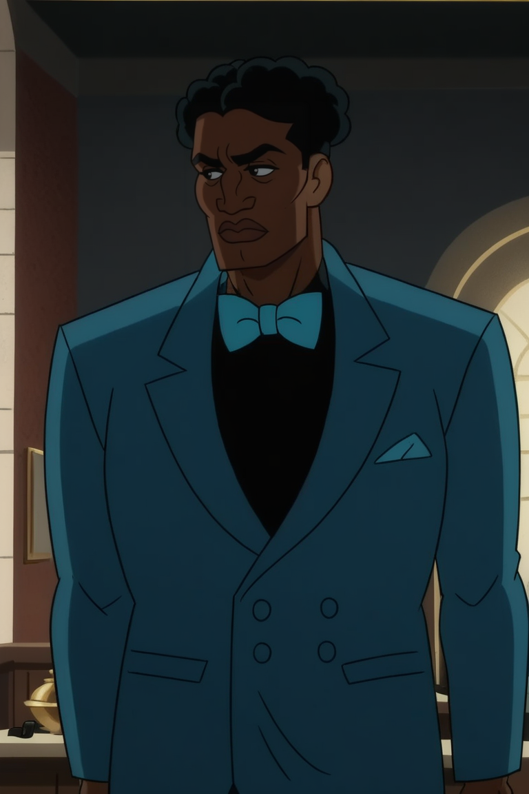 **DETECTIVE 플라스: Arn_Flass, 1boy, 남성, 검은 피부 남성, 단발, 검은 셔츠, 파란 리본, 자켓, 파란 정장, 바지
