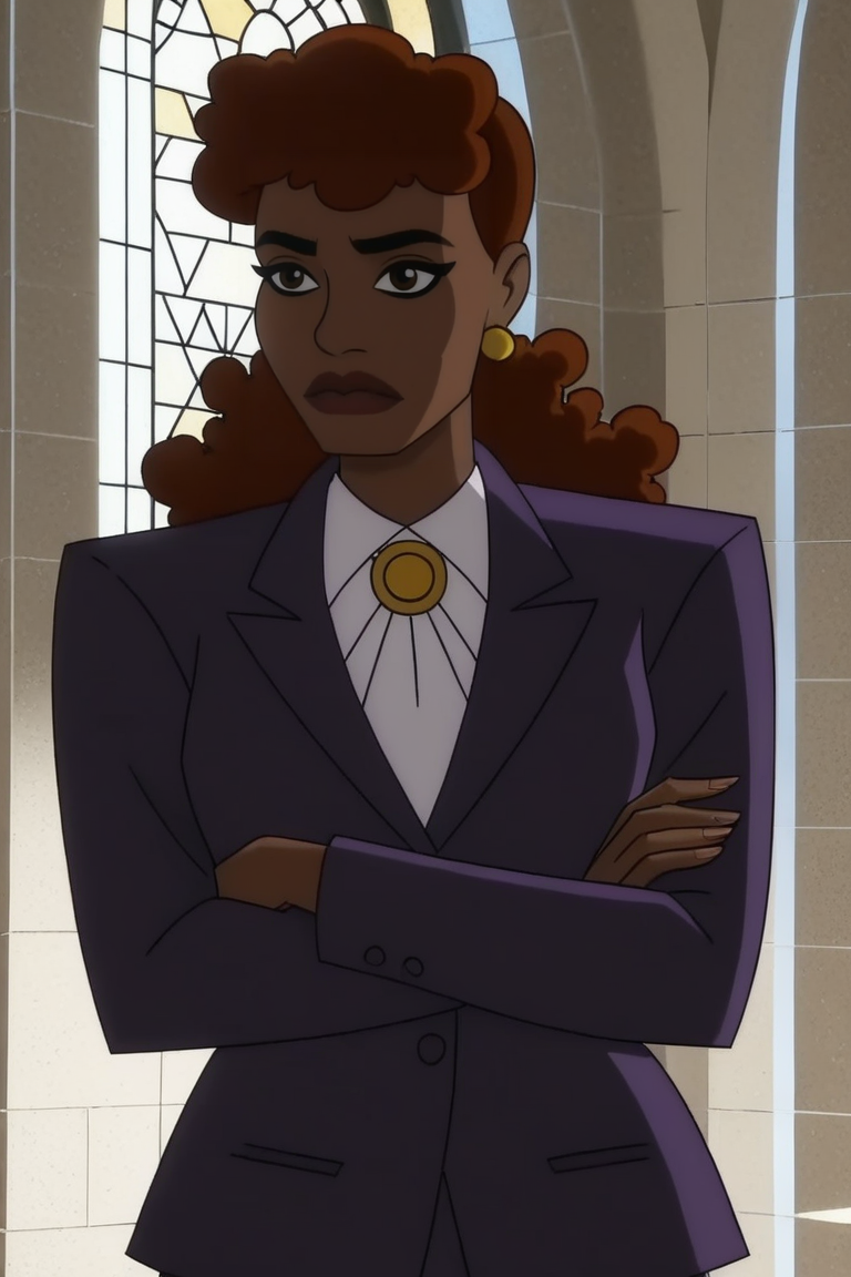 바바라 고든: Babs_Gordon, 1girl, 여성, 검은 피부, 검은 피부 여성, 붉은 머리, 셔츠, 보석, 자켓, 흰색 셔츠, 귀걸이, 정장