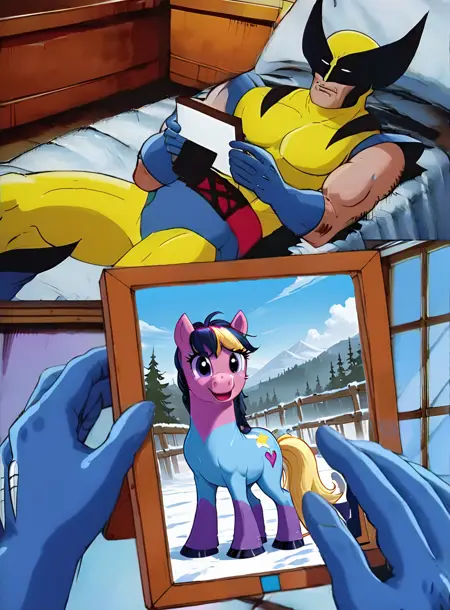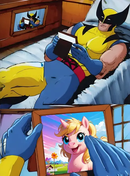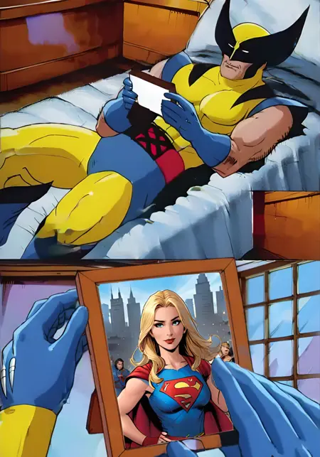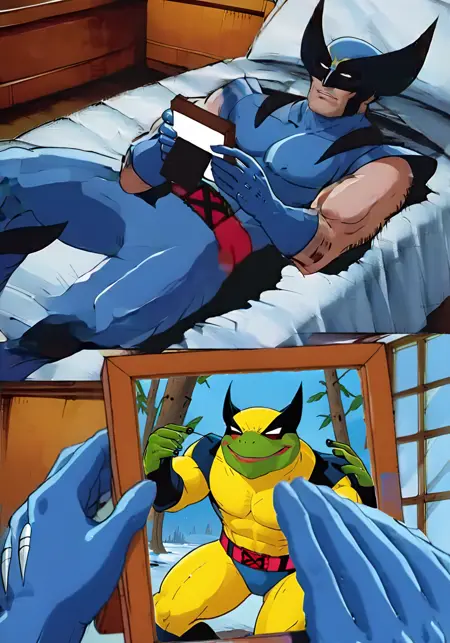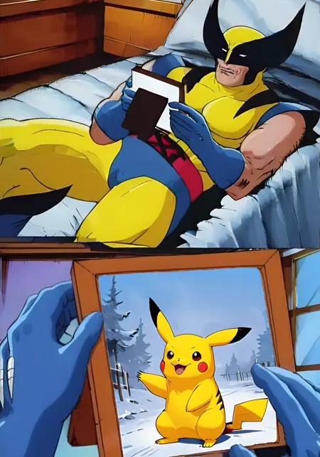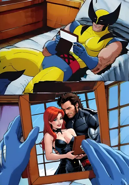 构建提示的最佳方式为:“金刚狼手持(你选择的角色)的照片框,漫画分镜,wolvmemesdxl,卡通,最佳画质,双面板”