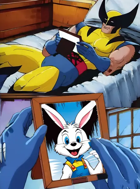Best way to structure the promt is "Wolverine holding a picture frame of (your choice of character), comic panels, wolvmemesdxl, cartoon, best quality, 2panel"