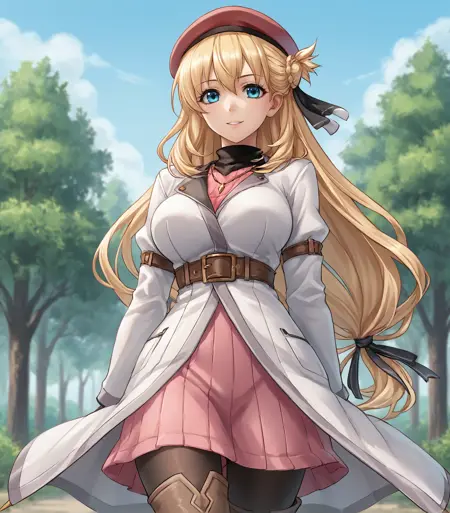 <lora:AgnesClaudel:0.9>, Agnes Claudel, blonde hair, long hair, blue eyes, large breasts, hair ribbon, beret, white coat, turtleneck dress, necklace, belt, pink skirt, pantyhose, brown boots, thigh boots,