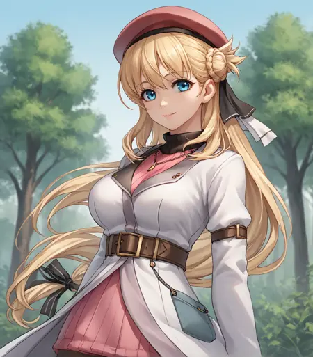 <lora:AgnesClaudelKai:0.9>, Agnes Claudel, blonde hair, long hair, white ribbon, red ribbon, hair ribbon, blue eyes, large breasts, skinny, red beret, white shirt, long sleeves, pendant, cleavage cutout, brown corset, belt, blue pouch, bracelet, pink skirt, thigh boots,