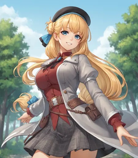<lora:AgnesClaudelKuro2:0.9>, Agnes Claudel, blonde hair, long hair, low-tied long hair, hair ribbon, blue eyes, large breasts, black beret, black neckwear, open grey coat, grey knee boots, plaid skirt, red shirt,