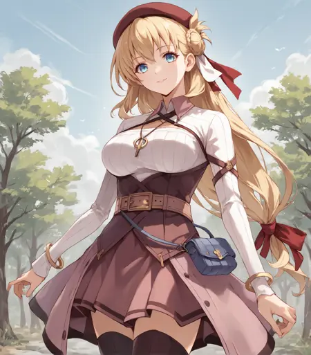 <lora:AgnesClaudelKai:0.9>, Agnes Claudel, blonde hair, long hair, white ribbon, red ribbon, hair ribbon, blue eyes, large breasts, skinny, red beret, white shirt, long sleeves, pendant, cleavage cutout, brown corset, belt, blue pouch, bracelet, pink skirt, thigh boots,