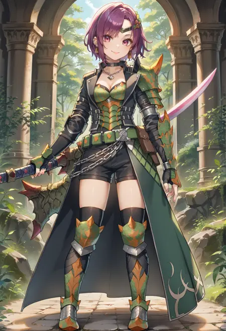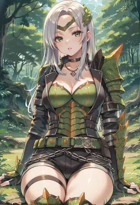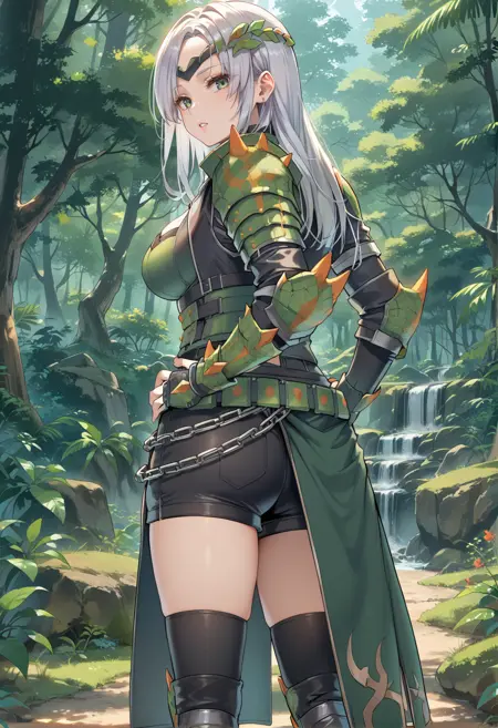 Tags (clothes): espinas armor, green pauldron, green knee boots, green belt, green gauntlets, green hair ornament, green breast armor, green totem skirt, black shorts