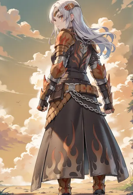 Tags (clothes-brown): espinas armor, brown knee boots, brown belt, brown pauldron, brown hair ornament, brown totem skirt, brown breast armor, brown gauntlets, black shorts