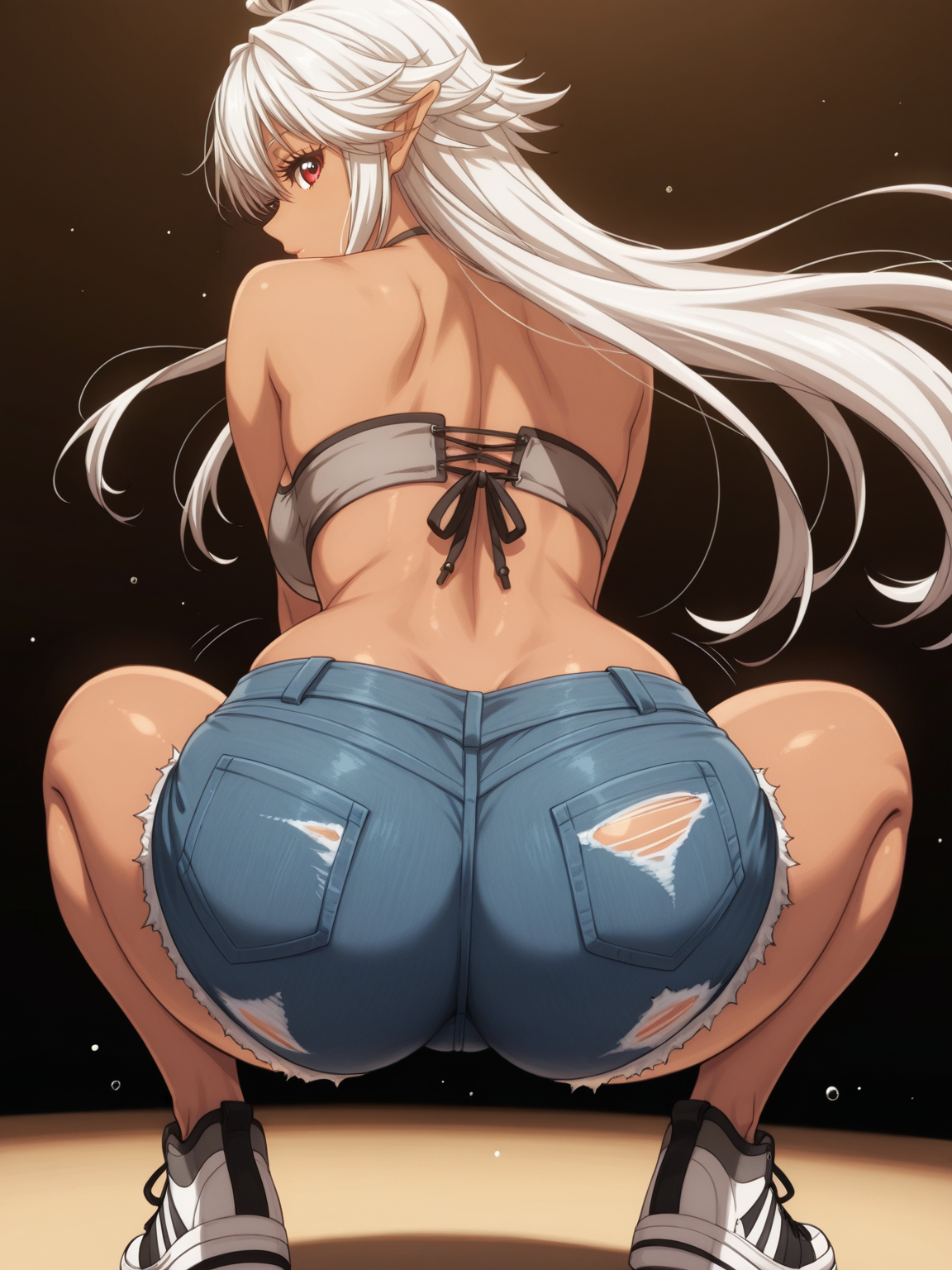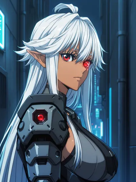 推荐提示词:e_lf, 1girl, white hair, long hair, elf ears, tanned skin, red eyes, long eyelashes