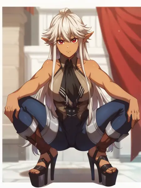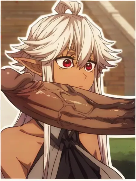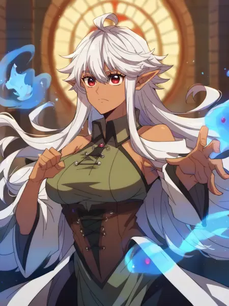 推荐提示词:e_lf, 1girl, white hair, long hair, elf ears, tanned skin, red eyes, long eyelashes