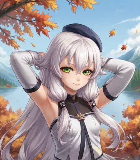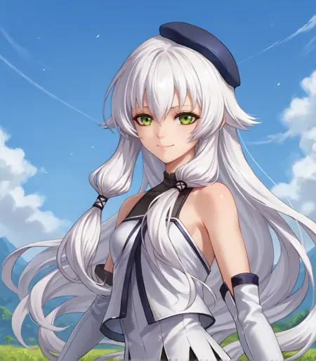 <lora:AltinaKai:0.9>, Altina Orion, 白髪, 長髪, トリックリボン, サイドロックス, 緑の目, 小さな胸, ベレー帽, 白いドレス, 分離式の袖, 黒いパンスト, 白いブーツ,