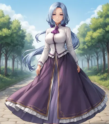 <lora:AurierVander:0.9>, Aurier Vander, 长发, 长侧发, 低马尾, 发带, 蓝发, 紫罗兰色眼睛, 大胸, 白色衬衫, 紫色领饰, 蓝宝石, 紫色裙子, 长裙, 鞋子,