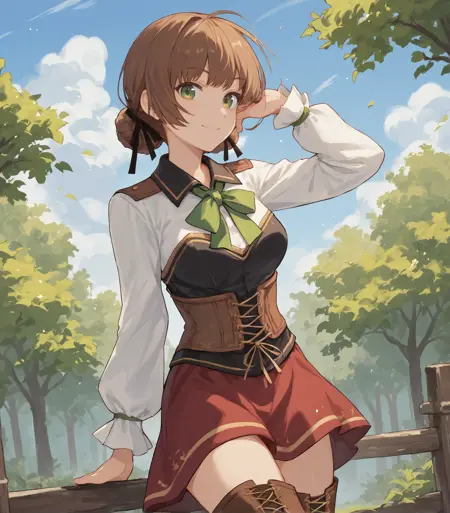 <lora:DuvalieCasual:0.9>, Duvalie, green eyes, brown hair, hair ribbon, hair bun, medium breasts, white shirt, green neckwear, corset, red skirt, brown thigh boots,
