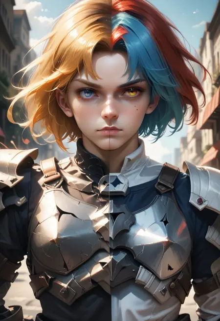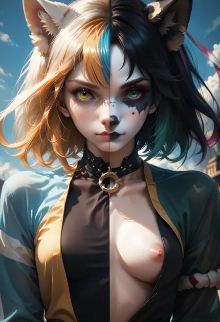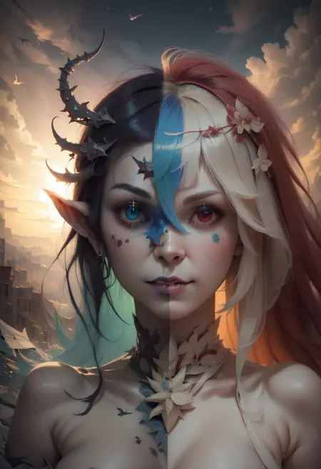 Divide the character's face, clothes, wings, accessories, etc. into two parts with appropriate transitions.