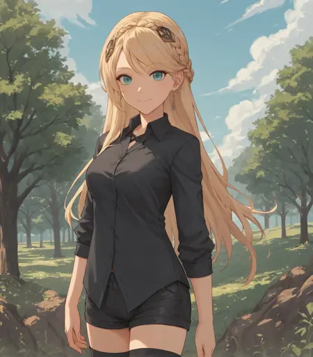 <lora:ElaineAuclairCasual:0.9> Elaine Auclair, aqua eyes, blonde hair, long hair, braid, hair ornament, medium breasts, earrings, black shirt, black shorts, black thighhighs, boots,