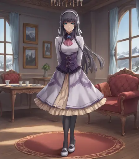 <lora:EliseSchwarzerCS1:0.9>, Elise Schwarzer, 青い瞳, 長い髪, 黒髪, ヘアバンド, 中くらいの胸, ドレス, 紫色のコルセット, スカート, 黒いパンスト, 白い靴,