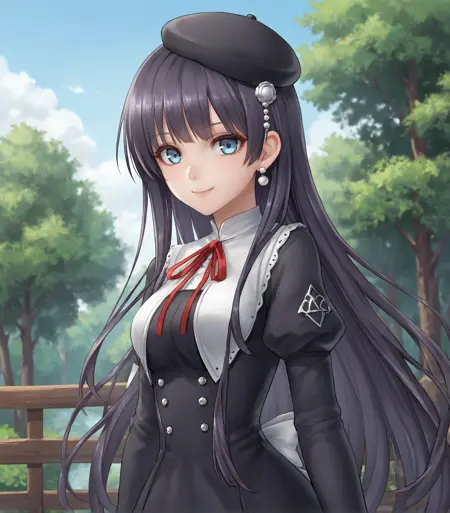 <lora:EliseSchwarzerStAstraia:0.9>, Elise Schwarzer, blue eyes, long hair, black hair, medium breasts, hair ornament, jewelry, pearl earrings, hat, black dress, red ribbon, black pantyhose, black shoes,
