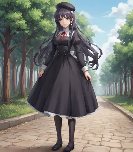 <lora:EliseSchwarzerCS1:0.9>, Elise Schwarzer, blue eyes, long hair, black hair, hairband, medium breasts, dress, purple corset, skirt, black pantyhose, white shoes,