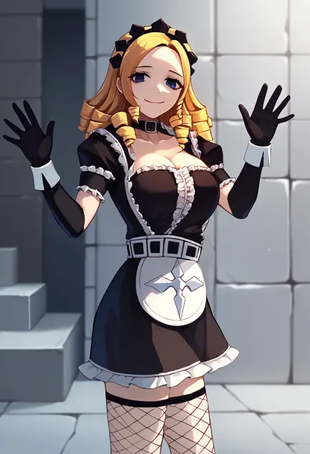 Default Outfit: black hairband, maid headdress, frills, black dress, puffy short sleeves, black gloves, elbow gloves, fishnet thighhighs, choker, collar, cleavage
