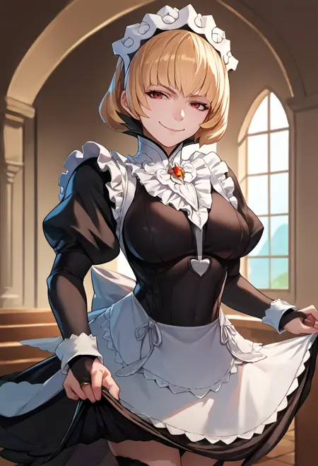 默认服装: 比基尼甲胄、肩甲、护肩、护手、黑色过膝长袜、吊袜带、露脐、肚脐、胸沟