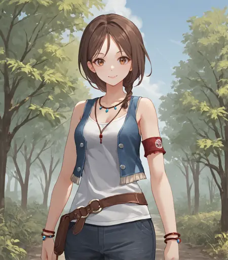 <lora:HalColeman:0.9>, Hal Coleman, 갈색 머리, 단발, 땋은 지마, 갈색 눈, 중간 크기의 가슴, 보석, 파란색 조끼, 흰색 캐미솔, 갈색 벨트, 회색 미니스커트, 빨간 팔찌, 팔찌, 빨간 샌들,