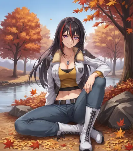 <lora:EmiliaHarling:0.9>, Emilia Harling, 검은 머리, 스트라이프 머리, 빨간 머리, 긴 머리, 눈 사이의 머리, 보라색 눈, 큰 가슴, 흰색 재킷, 털 장식이 있는 재킷, 긴 소매, 강제 목걸이, 가슴 사이, 노란색 셔츠, 허리, 배꼽, 청바지, 벨트, 흰색 부츠,