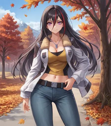 <lora:EmiliaHarling:0.9>, Emilia Harling, black hair, streaked hair, red hair, long hair, hair between eyes, purple eyes, large breasts, white jacket, fur-trimmed jacket, long sleeves, dog tags, cleavage, yellow shirt, midriff, navel, jeans, belt, white boots,