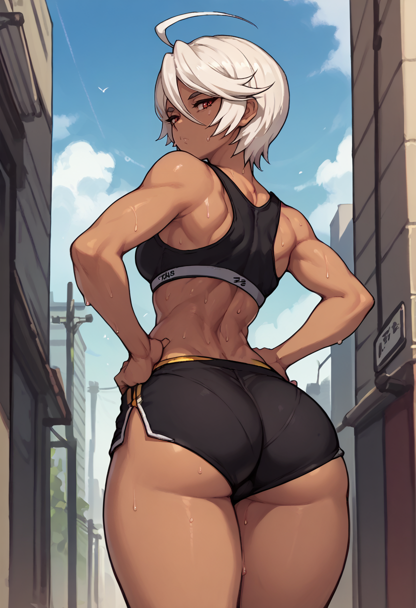 트리거 + 외모: yamamoto akira, 검은 피부, 흰 머리, ahoge