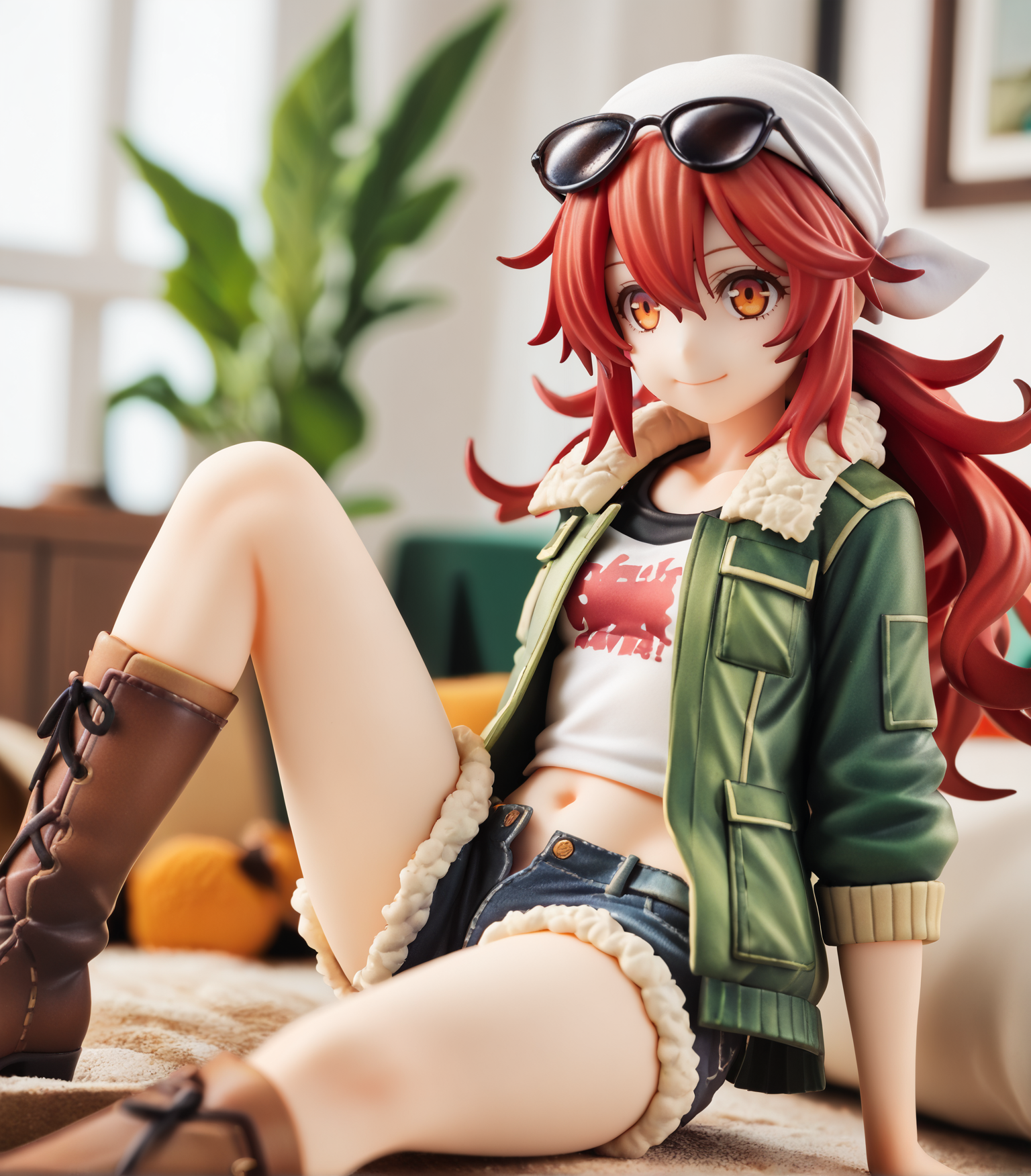 <lora:Jingo:0.9>, Jingo, long hair, red hair, messy hair, sidelocks, orange eyes, small breasts, short, sunglasses on hair, white bandana, green jacket, open jacket, cutoffs, crop top, navel, fur lined shorts, jean shorts, brown boots,