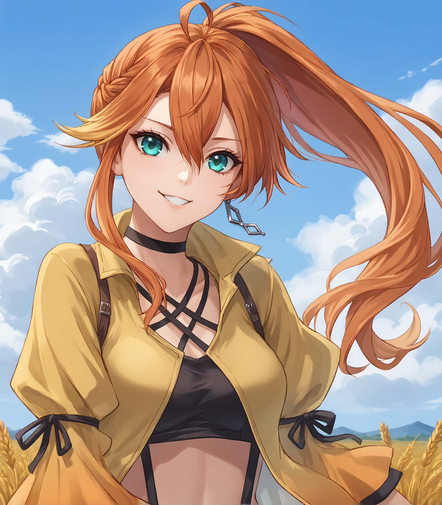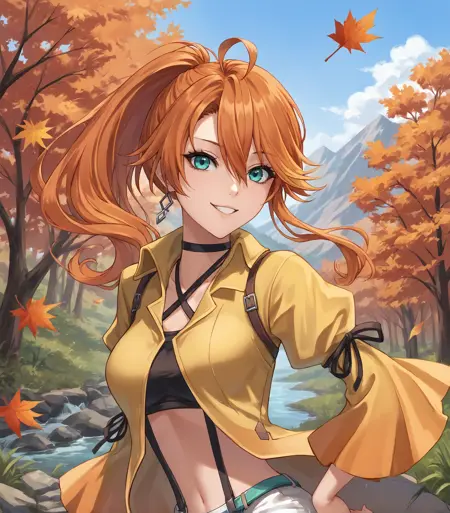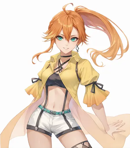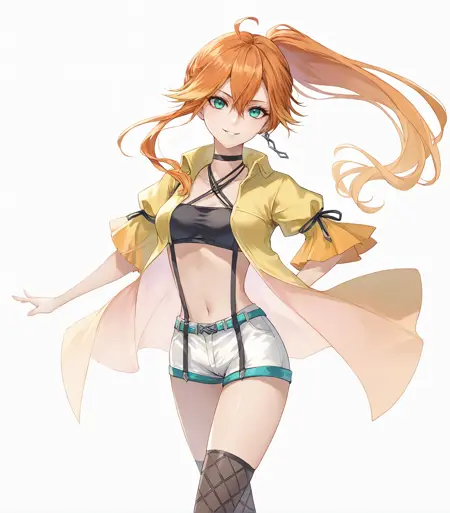 <lora:JudithKai:0.9>, Judith Ranster, 오렌지색 머리, 이톤 머리, 플리츠, 아호게, 아쿠아색 눈, 중간 크기 가슴, 한쪽 귀걸이, 초커, 노란색 코트, 검정 밴도, 흰색 반바지, 스타킹, 피시넷 허벅지 스타킹, 검정 허벅지 스타킹, 흰색 하이힐,